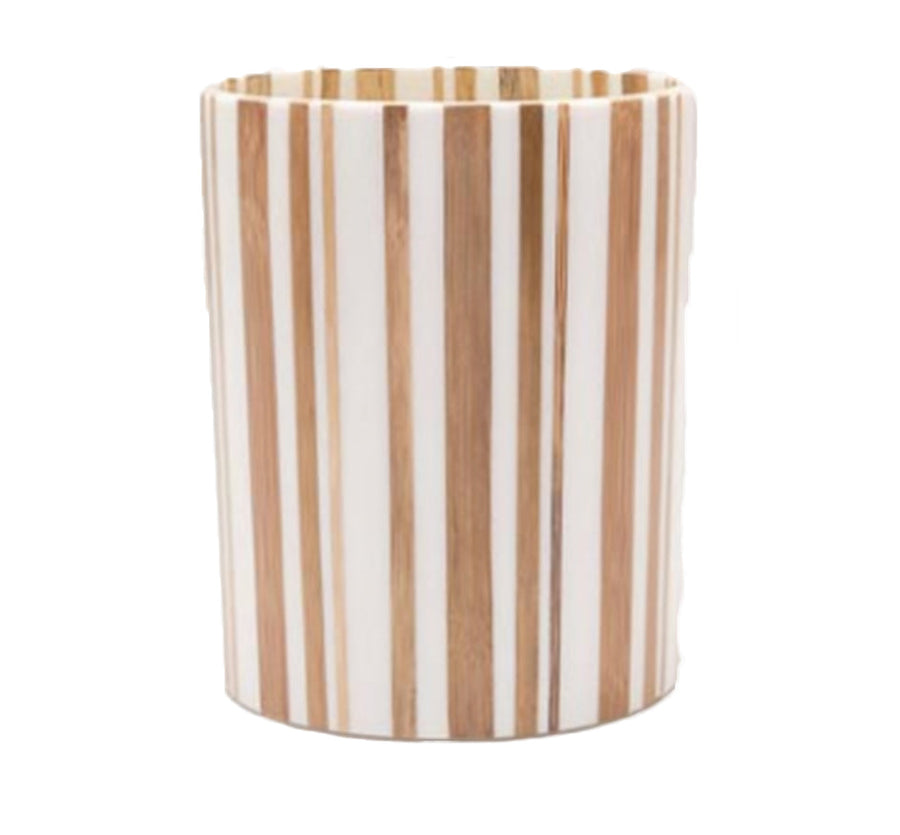 Organic material goes mid-century cool. Strips of bamboo set in sharp white resin give the Ashford a naturally graphic look. Perfect for capturing the feel of an upscale spa in any bath. Wastebaskets include gray powder coated metal liner.