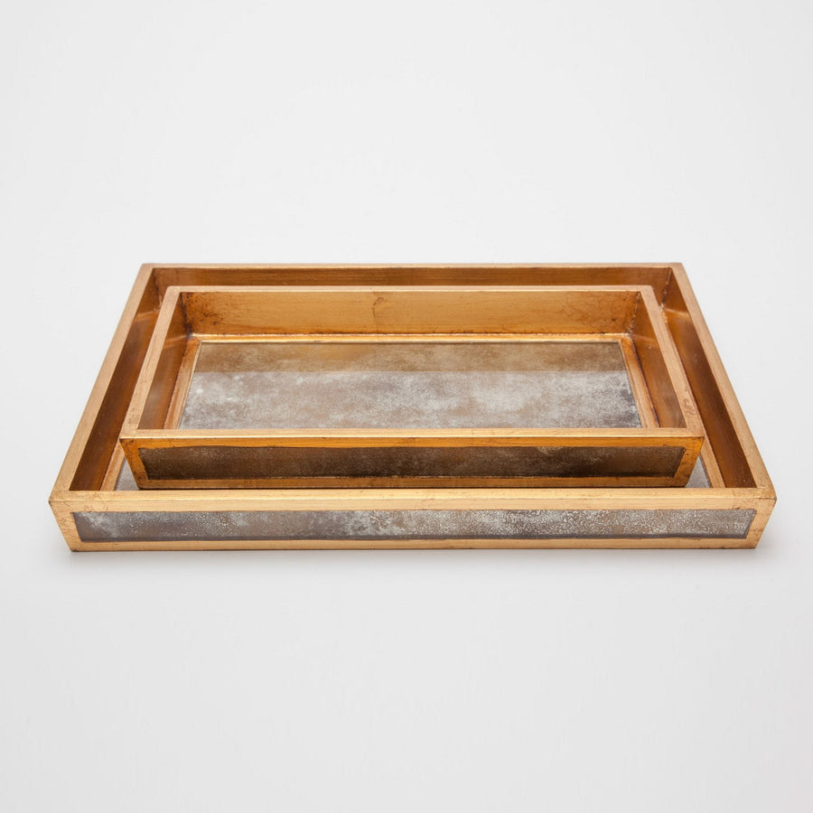 Our gold-antiqued mirror finish with gold-leafed wood brings a wonderfully warm touch. Wastebaskets include gray powder coated metal liner.