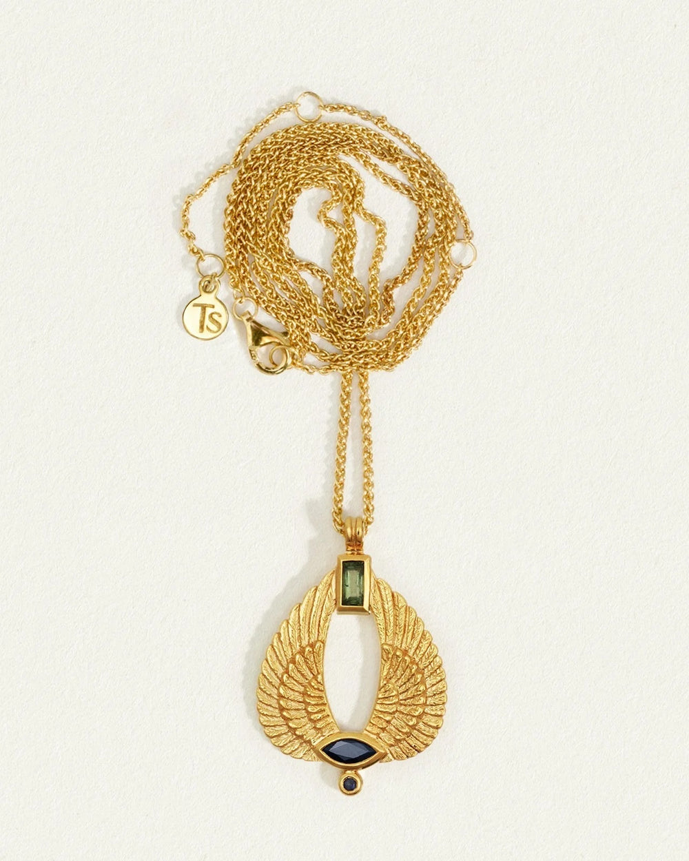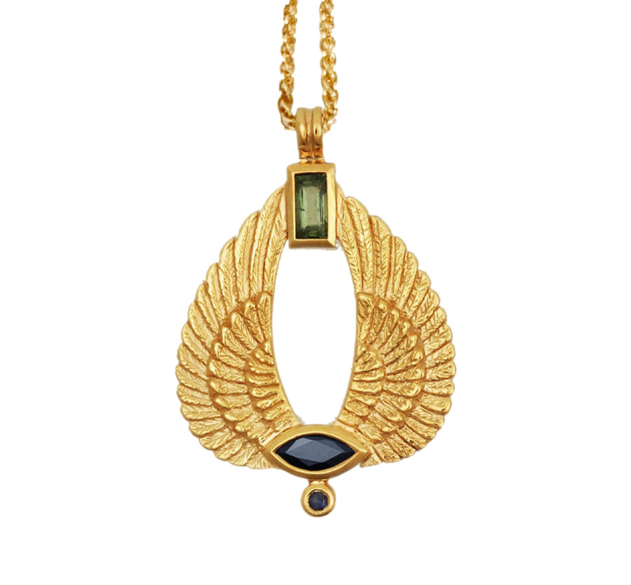 The wings signify spirituality, holiness and lightness to the world; with a baguette cut Green Apatite regarded for harnessing personal power, marquise iolite and sapphire for wisdom. The Aum necklace is an elegant talisman of warmth and protection.