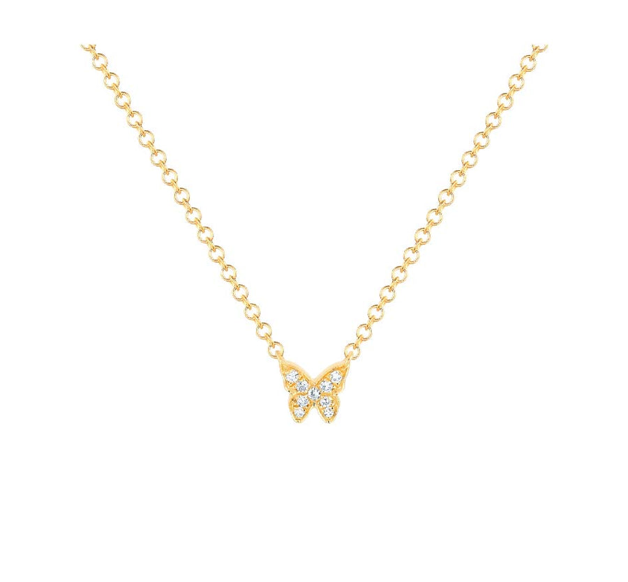 Let your style flutter. A miniature diamond butterfly sits at the center of a delicate ring-linked chain in this simple yet timeless necklace. It features 0.02 cttw diamond set in 14k gold.