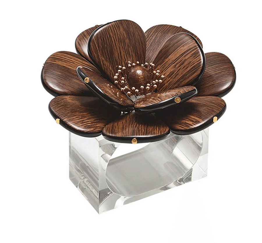 The Begonia Napkin Ring radiates year-round beauty, warmth, and striking elegance like its namesake flower. Crafted from acrylic beads with a faux wood finish, arranged around a central wooden bead and metal spokes, this napkin ring is perfect for introducing a touch of natural beauty to any table setting, making it a versatile and timeless accessory that works seamlessly throughout the year.