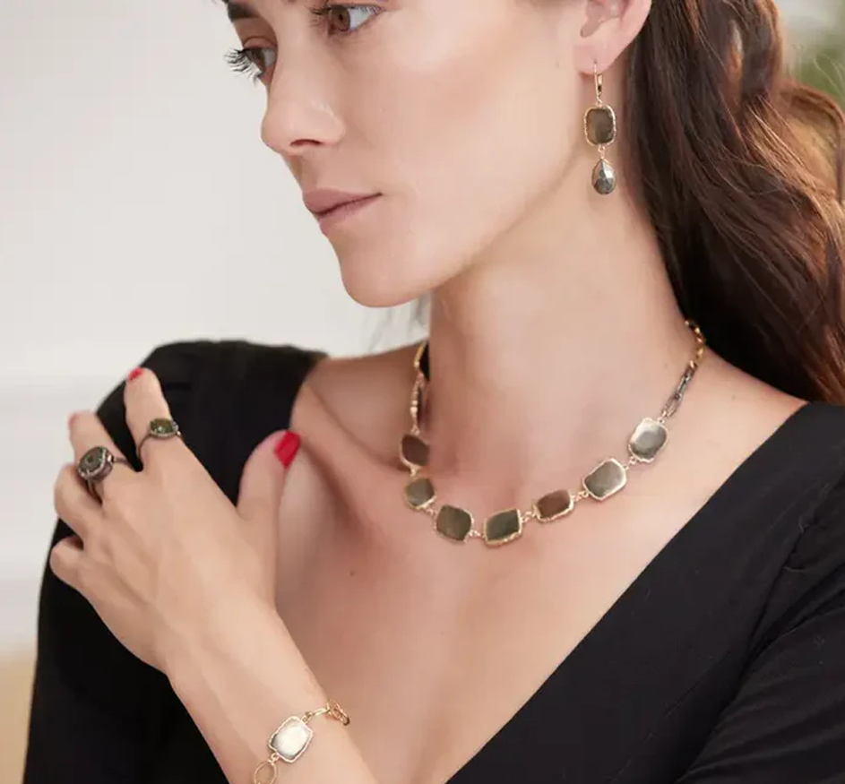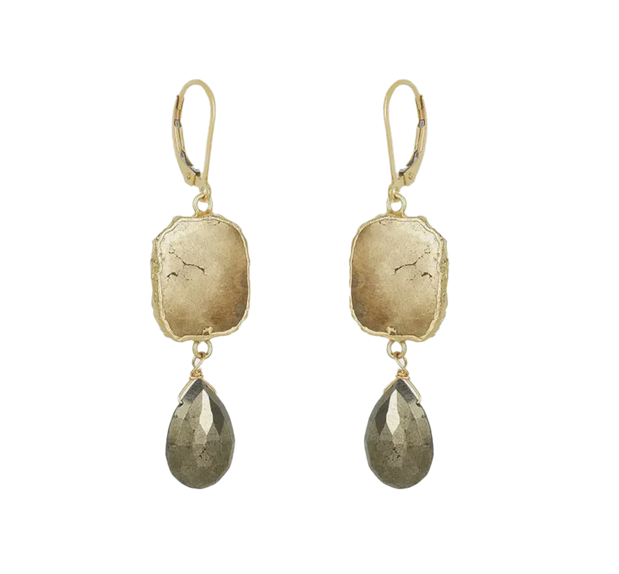 14k yellow gold-plated bezel set pyrite slab with pyrite tear drops.