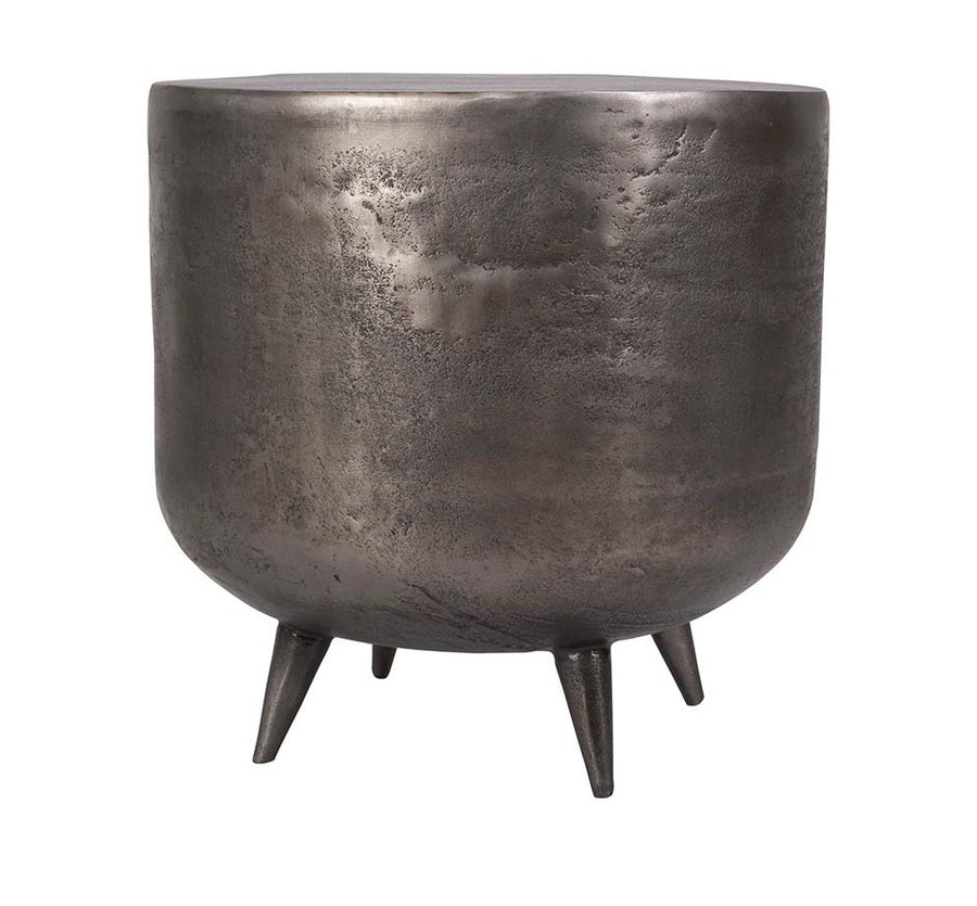 Adding a modern industrial touch, this drum side table in heavily textured cast aluminum features an antiqued nickel finish, resting on four small tapered feet.