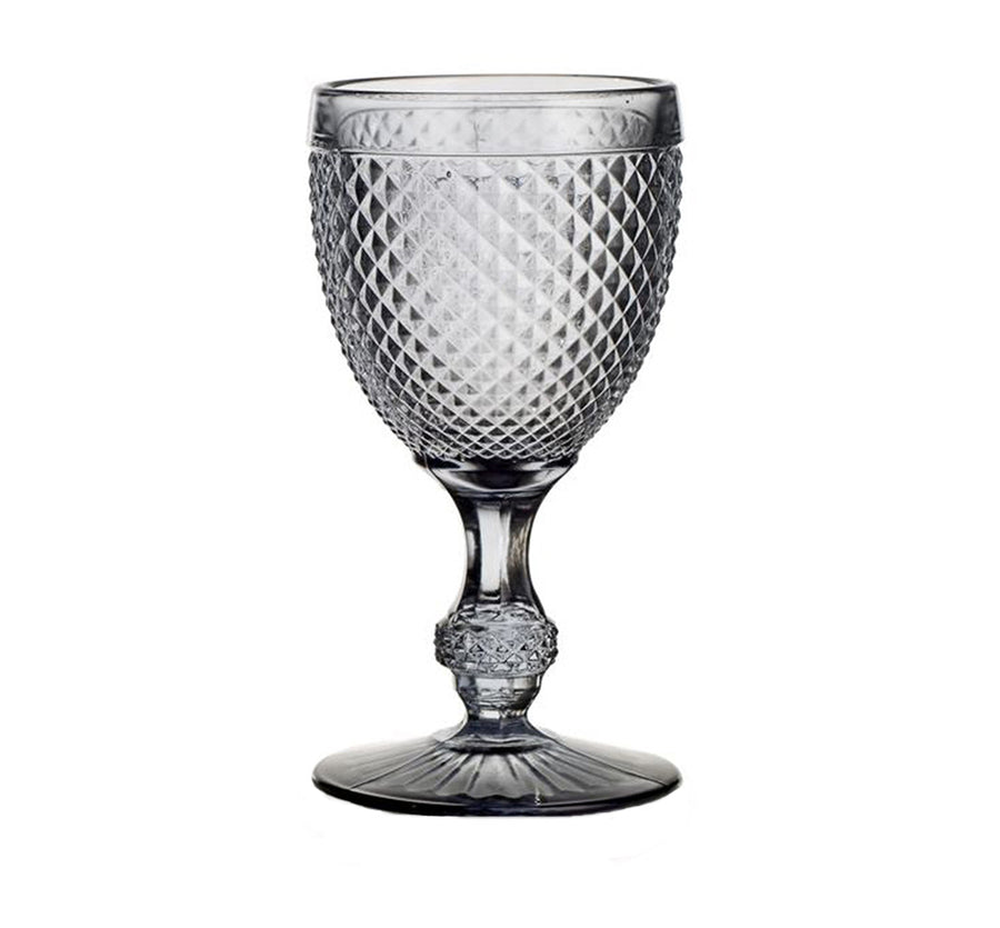 Faceted porcelain water goblets in a steely blue-grey add elegance to your table setting.