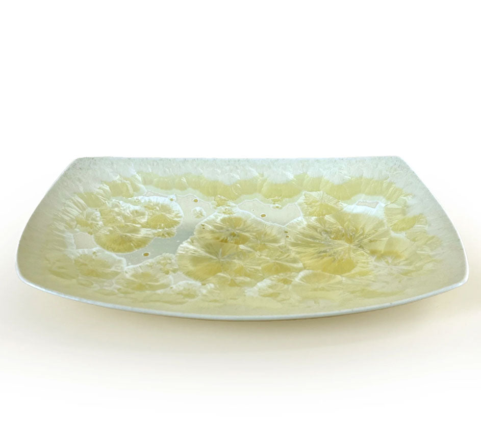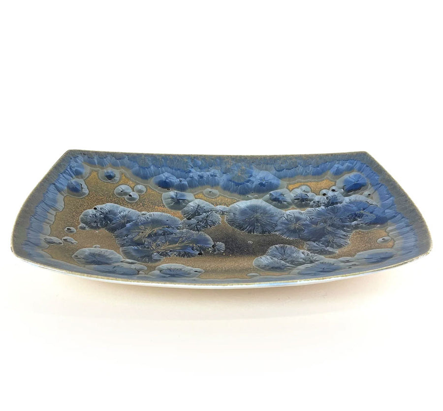 Borealis oval platter in blue or gold. Agate imported from the remote caves of…..no, just kidding; The Michael Wainwright USA Borealis collection is actually clay with a really cool crystal glaze, , and hand finished in Western Massachusetts by Michael himself. The Borealis collection is sure to attract attention. Looking for something different for yourself or as a gift? This is definitely it.