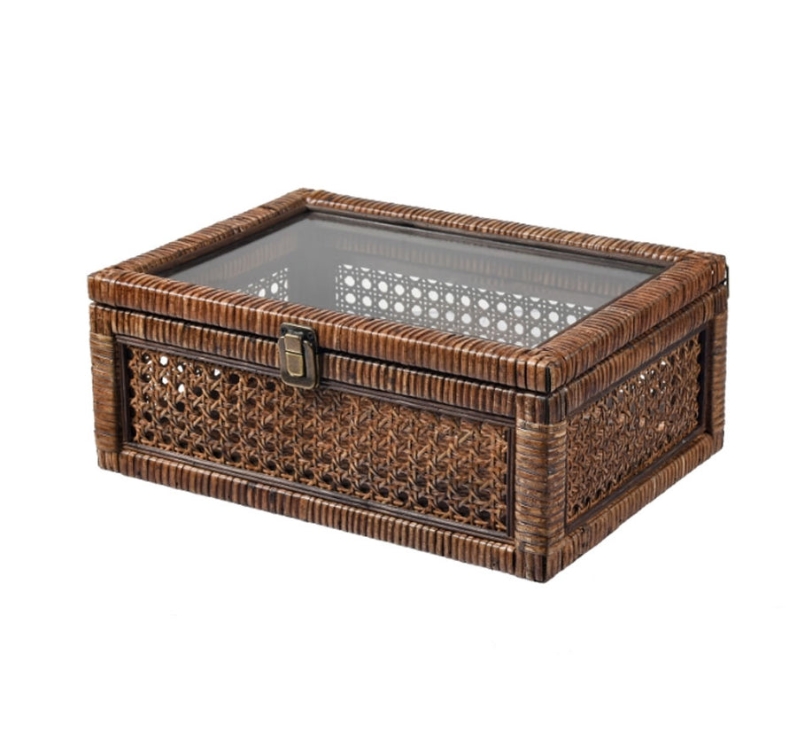 The Bowman Boxes, sold as a set of two, are rectangular woven rattan storage and display boxes in a rich brown finish. With clear glass panels on the lids, these boxes can be used to display important treasures.