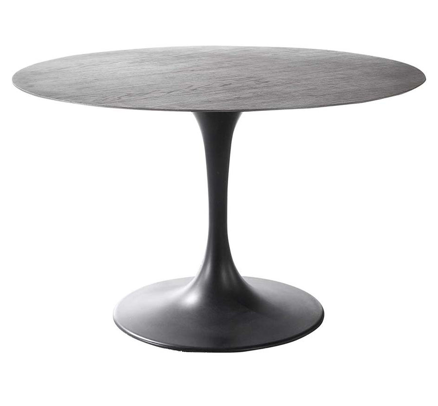 A mix of modern and industrial styling, featuring a 48 inch mushroom gray top in wire brushed oak veneer on a sturdy iron pedestal base in aged black.