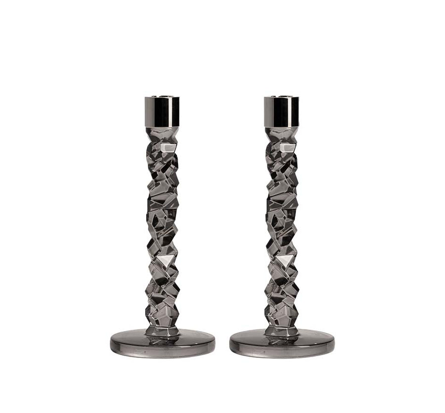The Carat collection is based on a contemporary interpretation of the traditional cut glass for which Orrefors is world-renowned. The irregular geometry produces beautiful reflections of light in the crystal. The medium candlestick in the color graphite is available as a set of 2 with stainless steel details. Designed by Lena Bergström.