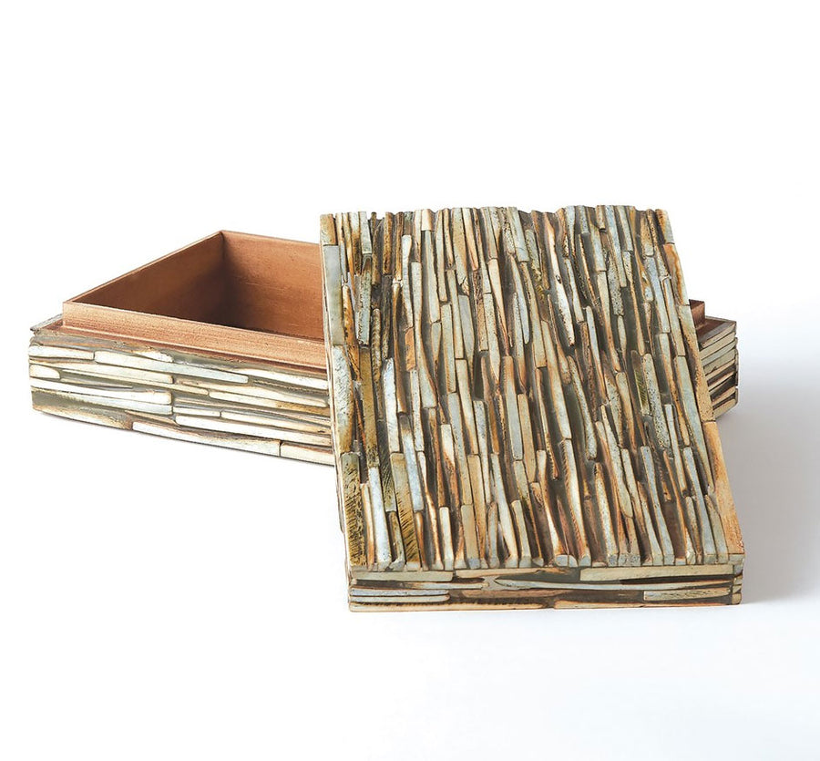 Our hand-hewn chiseled bone boxes have been given a gentle forest tint. Each is intricately crafted to reflect the beauty of the natural material. Detachable lids. Finished wooden interiors. Available in three sizes. Also available in Natural Bone.