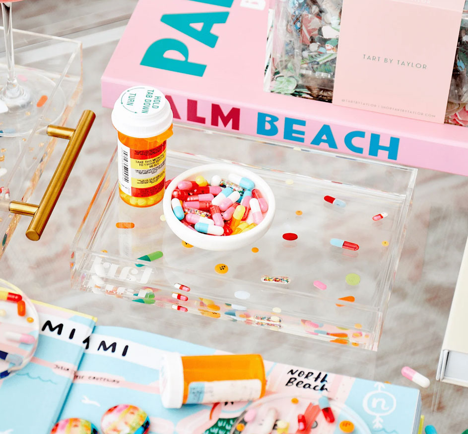 The uses for this tray are endless - perfect to keep on your bathroom sink or nightstand, on your coffee table or office desk, as a serving or charcuterie tray and the list goes on! Each tray is filled with various over the counter medications and hand-filled sprinkle/glitter capsules. Then covered in a thick layer of resin, making it totally waterproof and easy to clean.