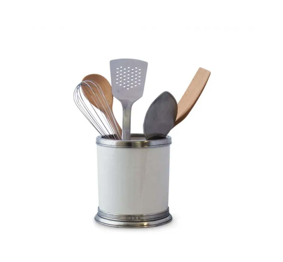An elegant ceramic and pewter vessel to place near your stove to accommodate an assortment of essential cooking utensils. The base of each is stamped with hallmarks representing our workshop, our company, the tin content of our alloy and the region of Italy where our pieces are made.