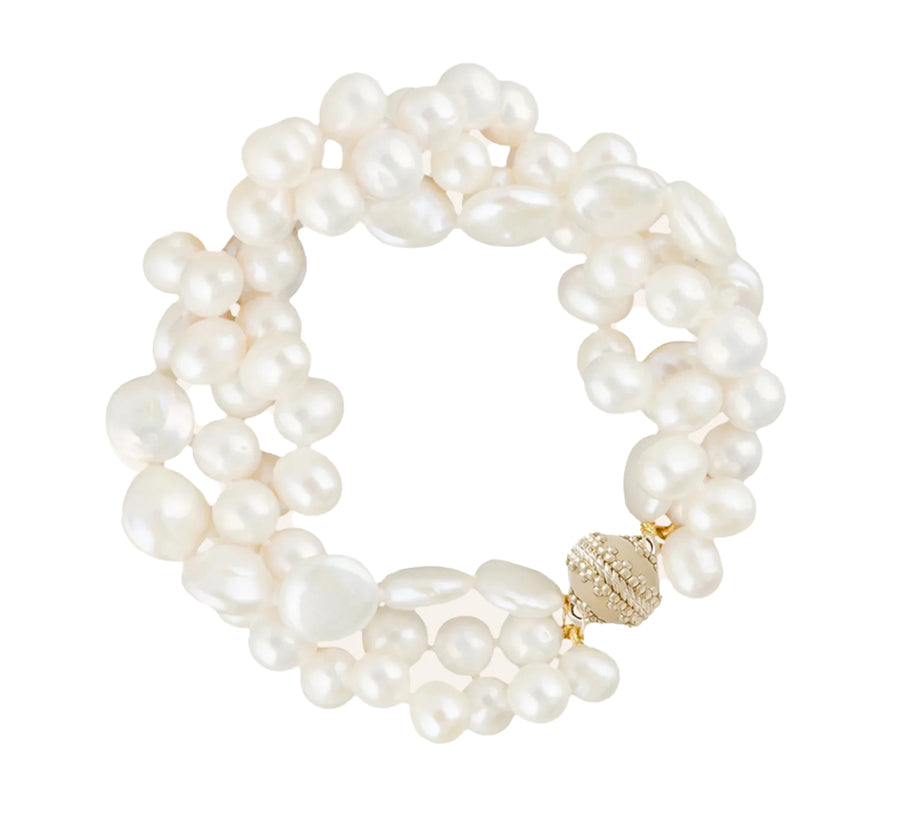Three strands of our favorite freshwater pearls. A perfect statement piece made up of coin, tip drilled, and potato pearls.