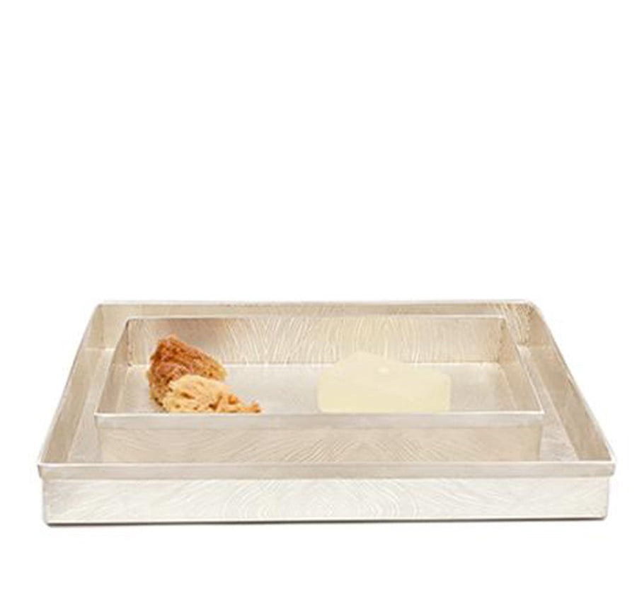 Wood-grain etching gives a natural edge to the elegant Metal. Rolled edges and a nice heft exemplify the collection’s exquisite quality.