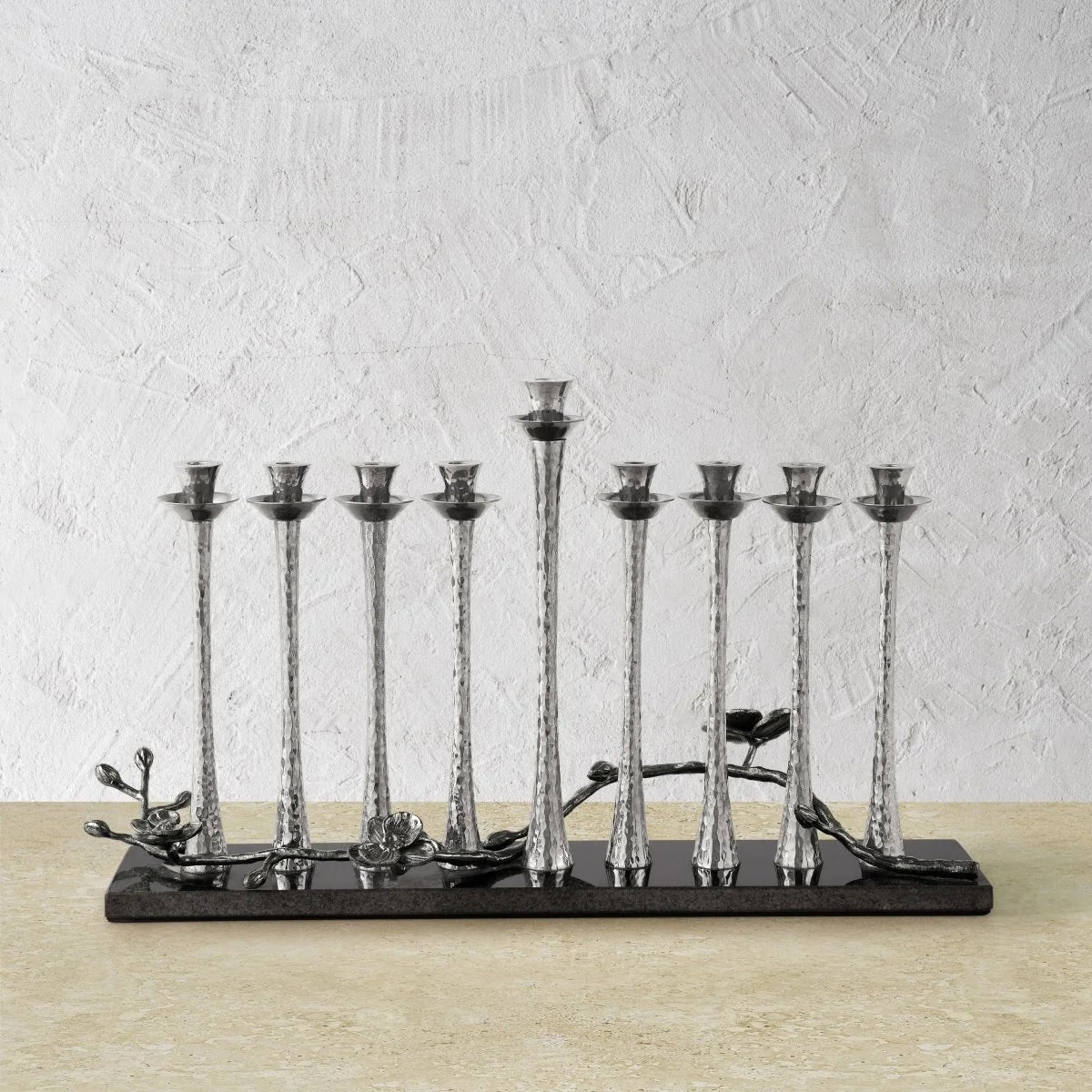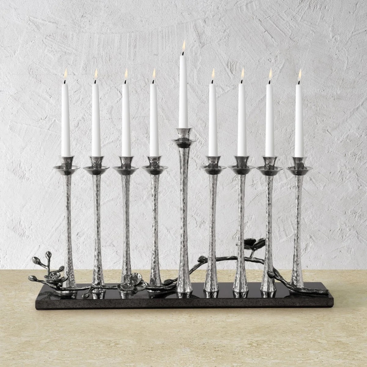 Handcrafted from Michael Aram’s Orchid Collection, the Black Orchid Menorah blends luxury, sculptural artistry, and spiritual significance. Inspired by the dark, seductive elegance of black orchids, its sleek design transforms a traditional ritual object into a striking centerpiece. Perfect for Hanukkah or as a decorative accent, each piece reflects meticulous handmade craftsmanship and sophisticated design.