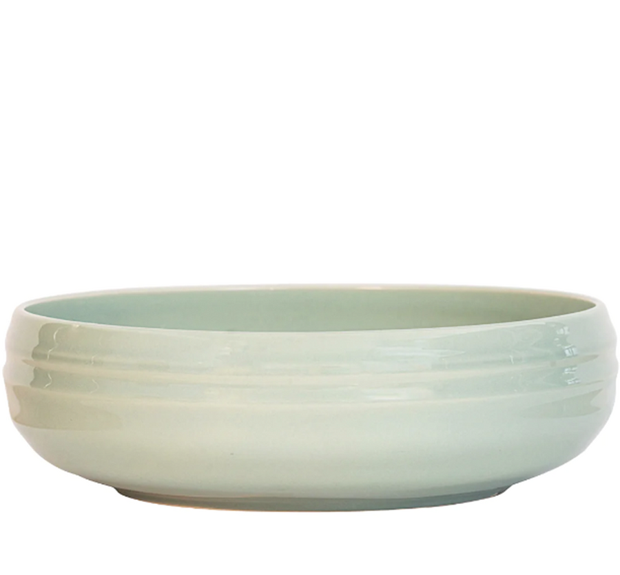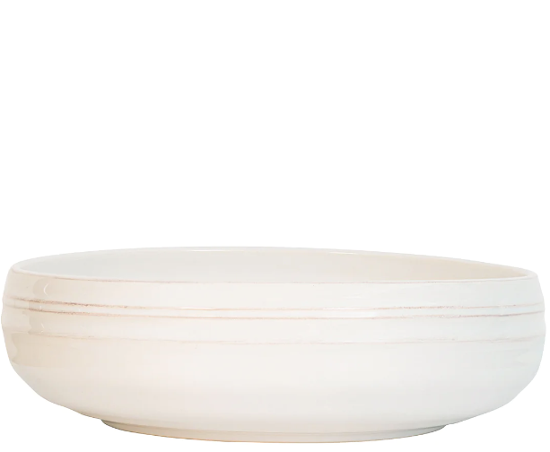 From our Bilbao Collection - Old-world patina meets modern silhouette with this large serving bowl that is the perfect vessel for serving up summer's fresh bounty of seafood, a hand-torn salad, or a handsome smattering of roasted potatoes. We also adore it as a mainstay fruit bowl on the countertop, or accent piece filled with found treasures from the seashore or forest floor. Measurements: 12"W x 3.5"H