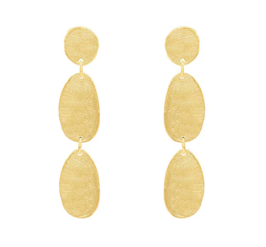 18k gold plated earrings with three organic coin shapes attached with jump rings.