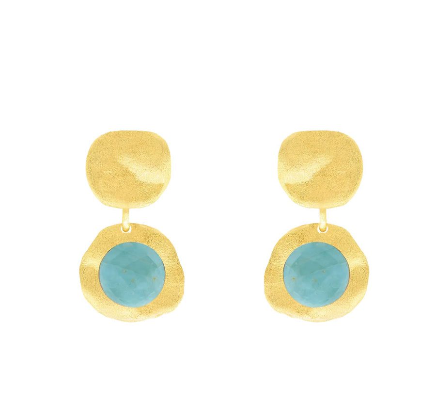 18k gold plated earrings made of 2 organic shapes with a stone in the bottom one.