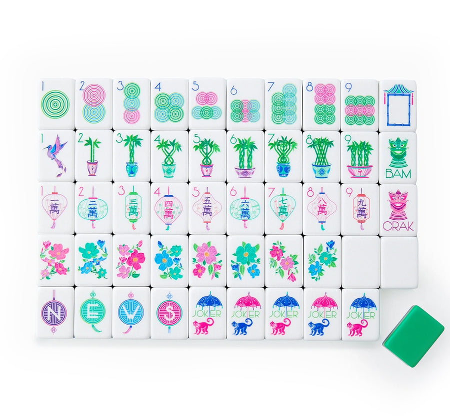 Tiles, a Dice/Coin Bag, and 4 Instructional Cards (you must purchase the NMJL Playing Card separately if you play American Mahjong).