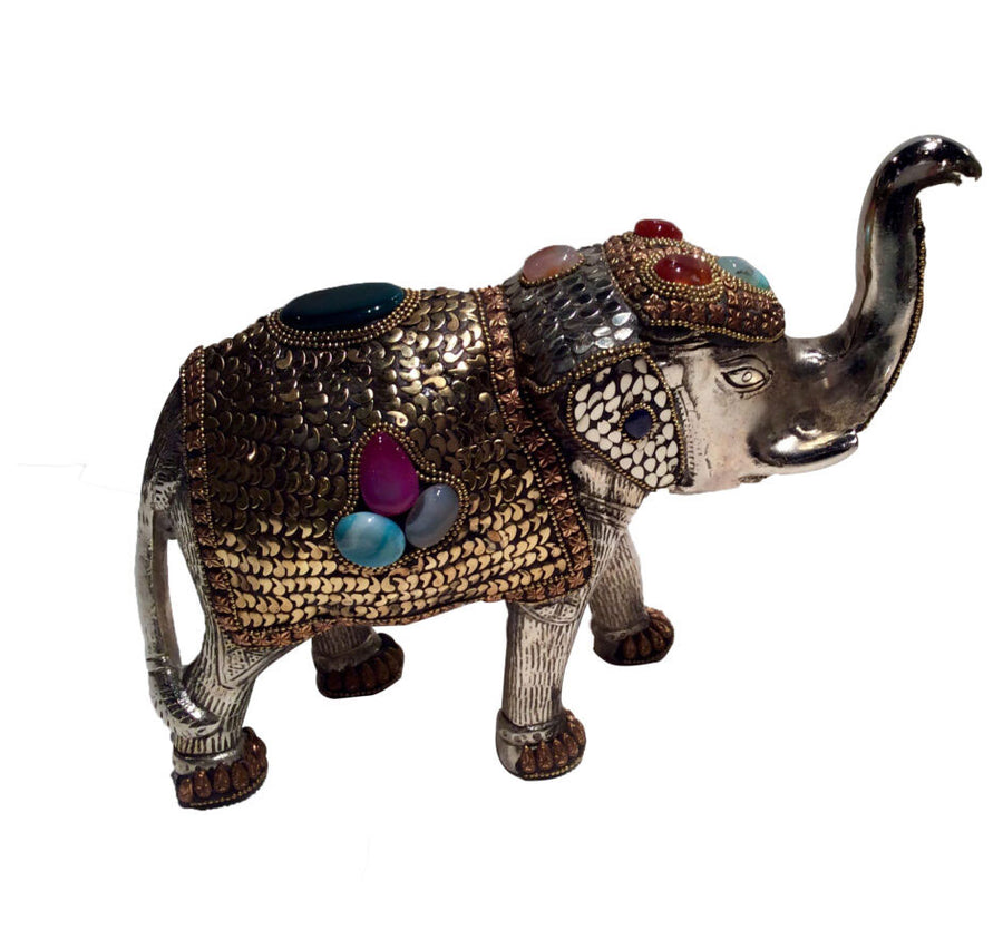 This exquisite Jeweled Elephant combines resin, brass, and carefully set jewels, showcasing intricate craftsmanship from India. Its detailed design highlights the blend of traditional artistry and durable materials, making it a distinguished decorative piece that adds cultural elegance and a refined accent to any space.