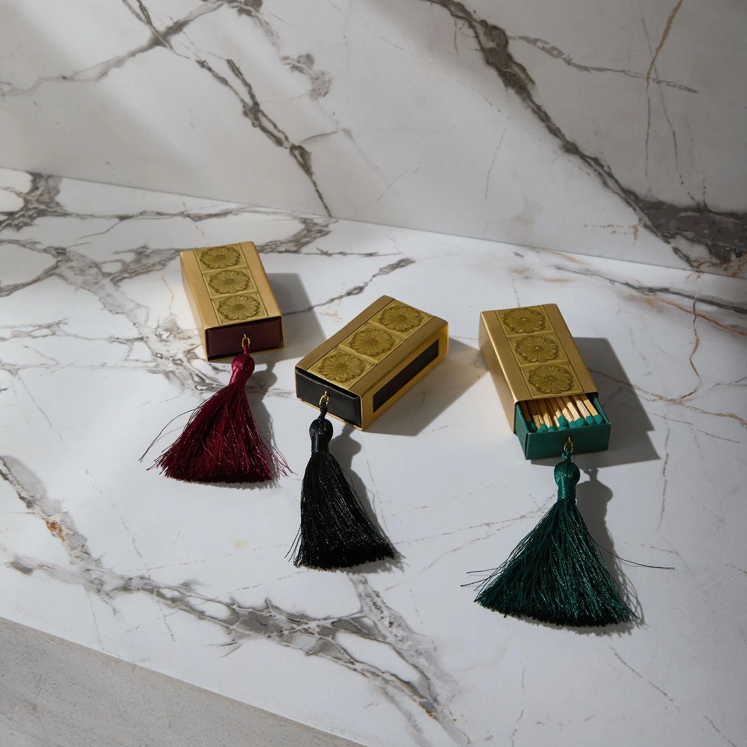 Crafted from solid brass and engraved with an intricate floral design, this elevated matchbox is finished with a silky tassel for a touch of texture and movement. Inside, 40 black-tipped matches rest in a linen-feel paper tray. Petite yet statement-making, it brings elegance and presence to home and gifting.