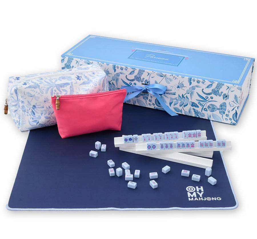 Take your Mahjong game wherever you go with our Mahjong Travel Set! This compact and lightweight set effortlessly slips into your carry-on, ensuring that the joy of Mahjong is always within reach on your adventures. Crafted with Preppy Soiree tile designs, this set exudes elegance and style.