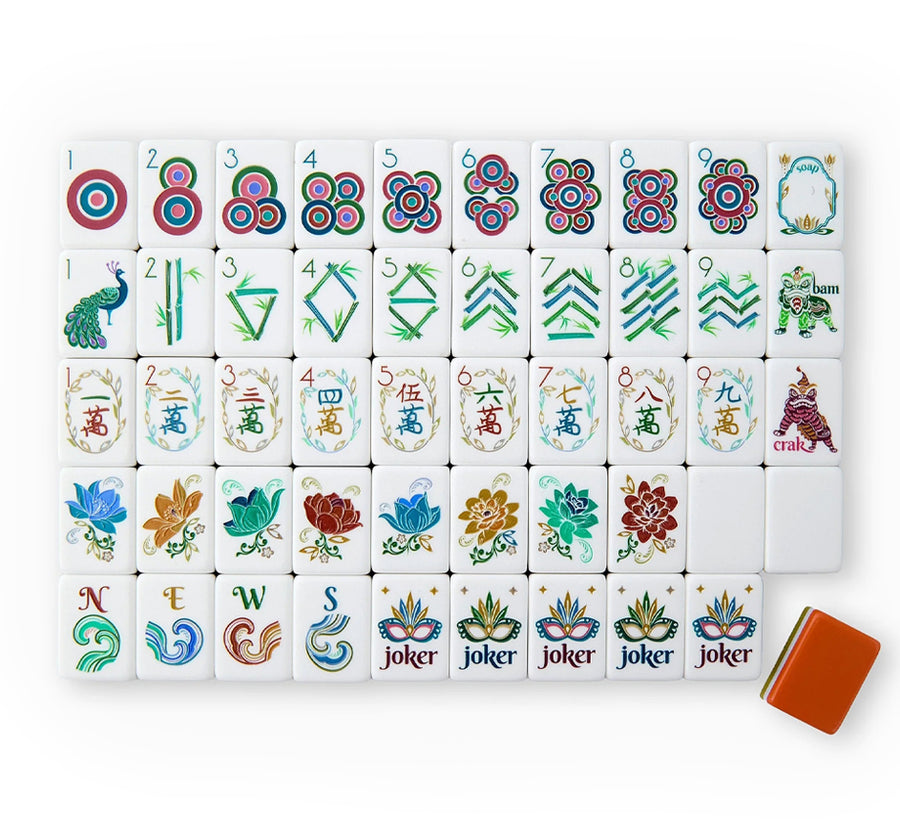 Tiles, a Dice/Coin Bag, and 4 Instructional Cards (you must purchase the NMJL Playing Card separately if you play American Mahjong).