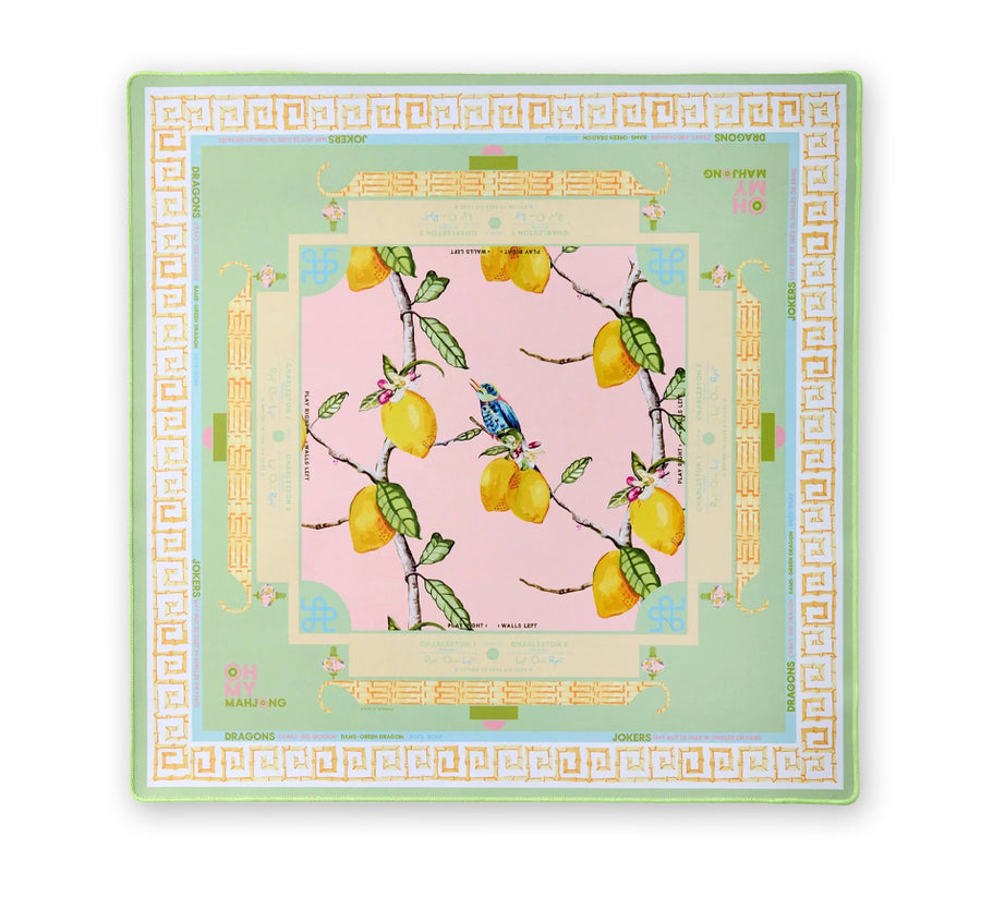 Infuse your game with elegance and whimsy with the Citrus Songbird Mat, a beautiful collaboration with CoCo Zentner! This mat showcases a delicate palette of pale green, pink, and yellow, perfectly complemented by a charming design featuring lemons and a pretty watercolor bird. The combination of soft colors and intricate details brings a refreshing, artistic touch to your mahjong sessions