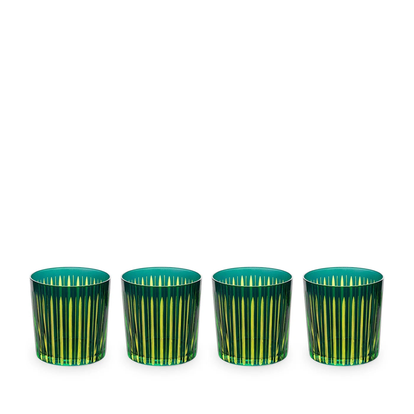 A glassware collection of bold color combinations, hand-cut and decorated to playfully reflect light. Available in Amber, Green, Purple, and Bordeaux.