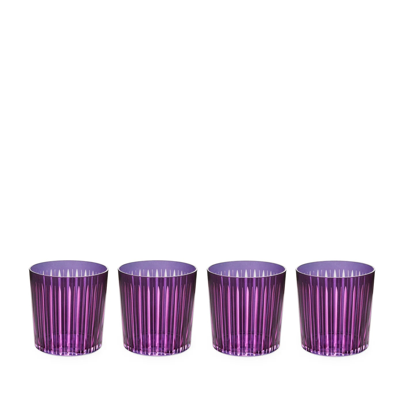 A glassware collection of bold color combinations, hand-cut and decorated to playfully reflect light. Available in Amber, Green, Purple, and Bordeaux.