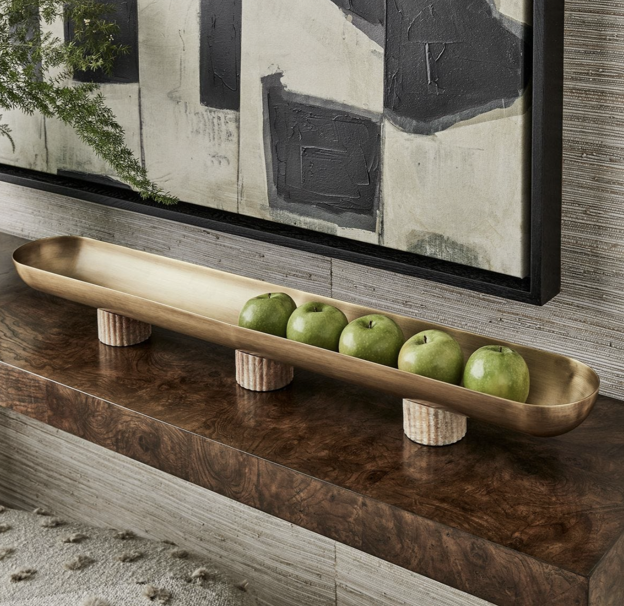 The elongated metal bowl in light antique brass finish rests upon three fluted plinths in latte onyx. A perfect centerpiece on its own or to display a collection.