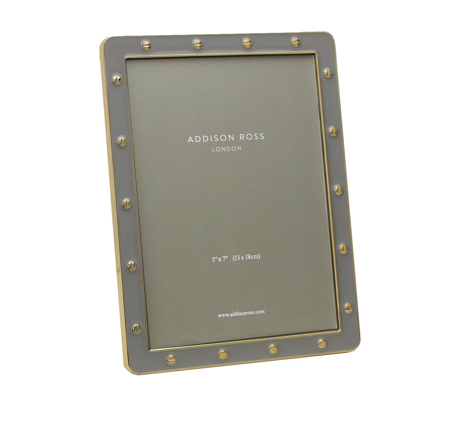 A beautiful chiffon enamel & gold or silver plate frame and screw detail, curved corners and a beautiful dove grey velvet backstand.