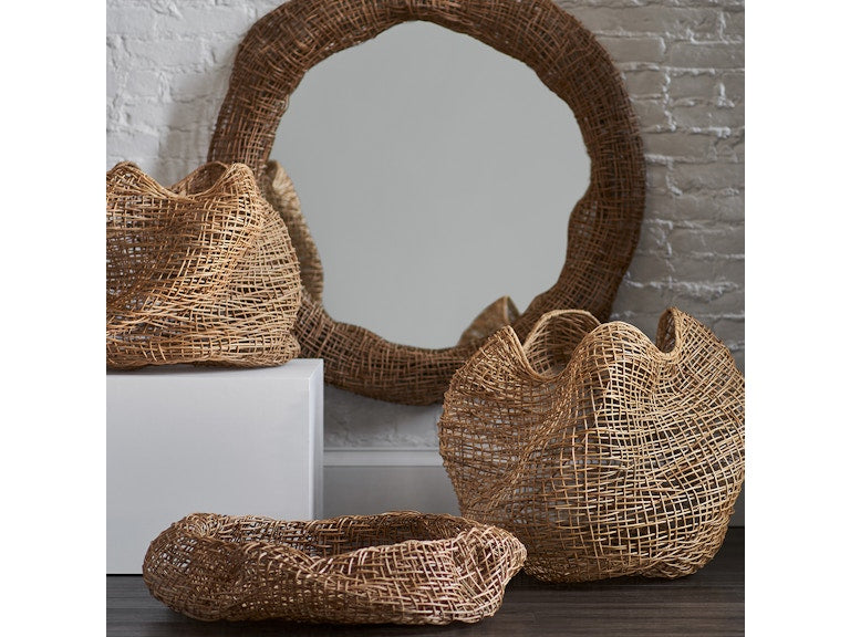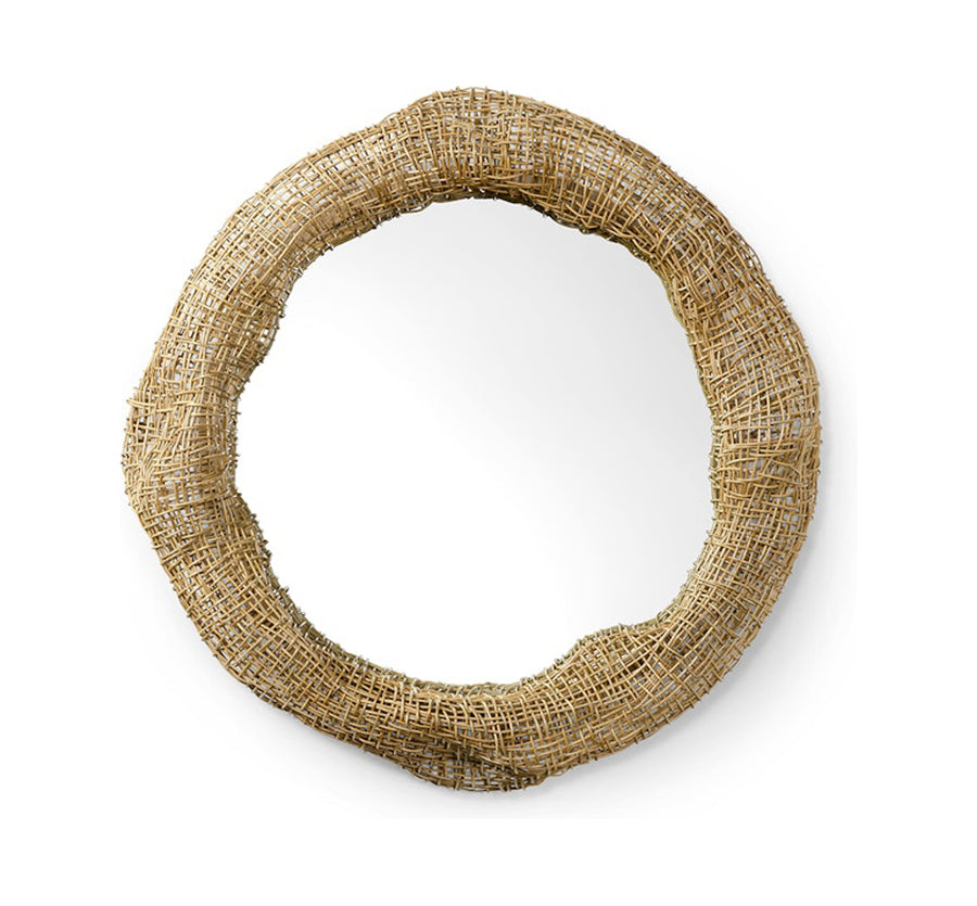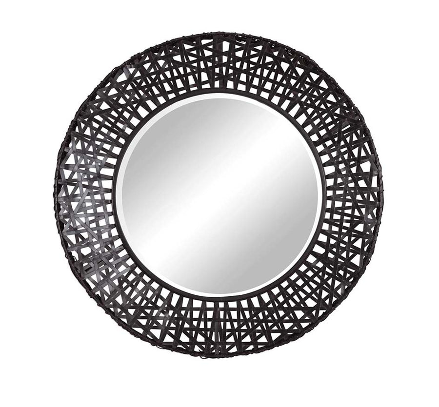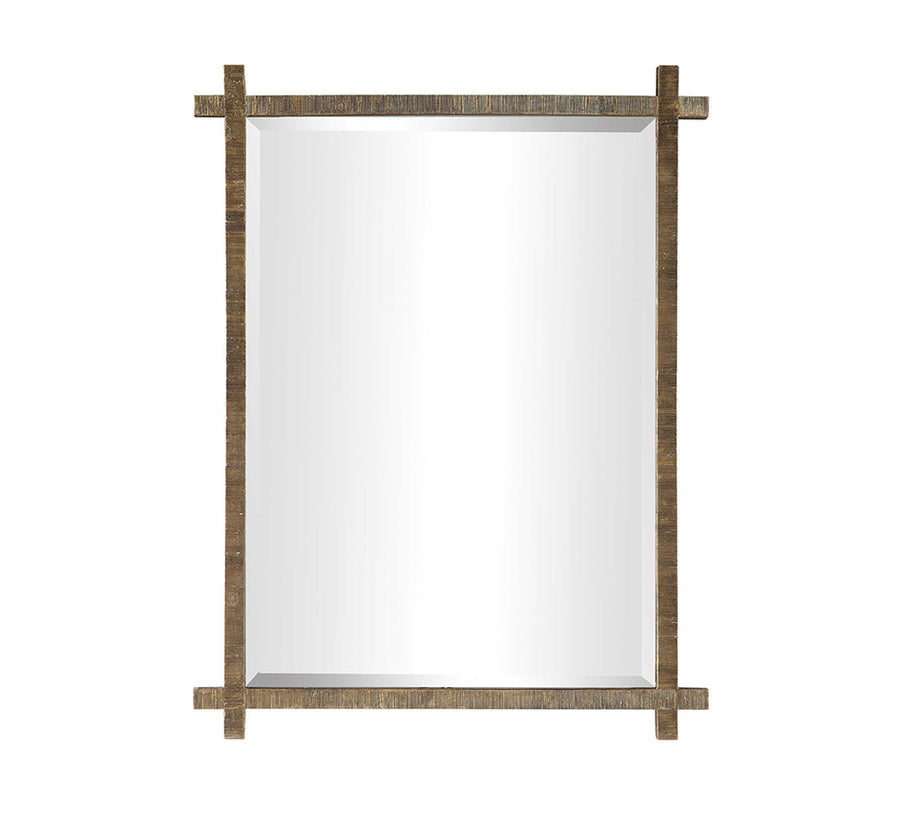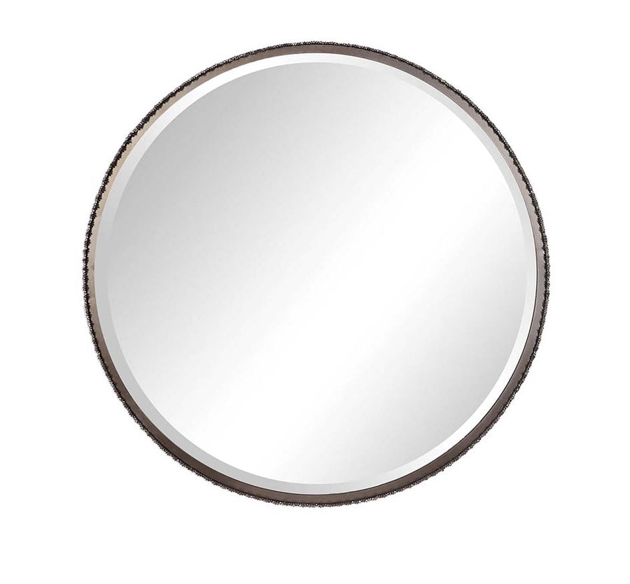 This 3-dimensional contemporary mirror features hand cut iron dowels in varying lengths welded to the outer edge of the frame, finished in a burnished steel silver. The mirror is surrounded by a considerable 1 1/4" bevel.