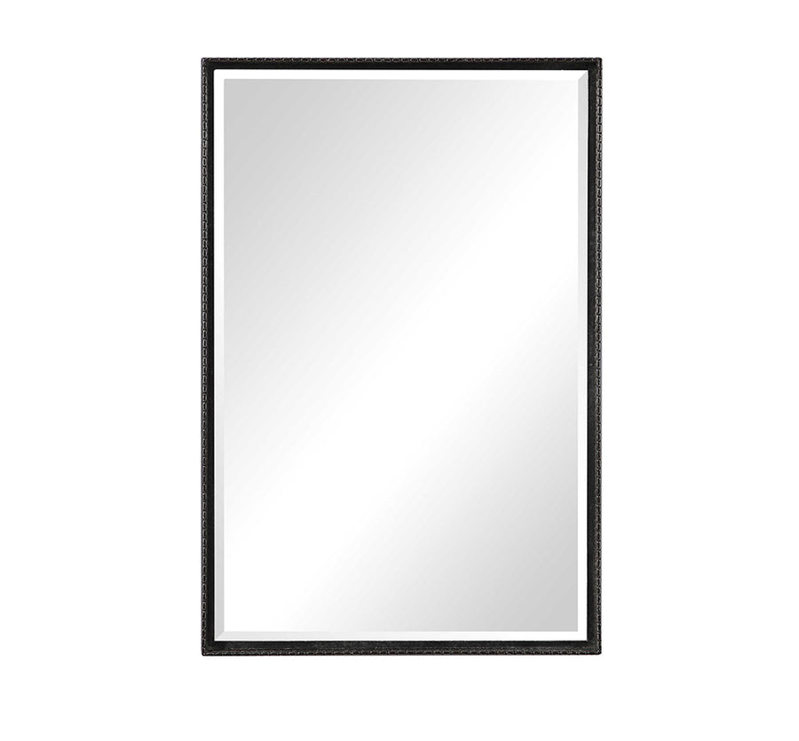 This simple vanity mirror features an iron construction with detailed edges. The slight profile frame is finished in a distressed rustic bronze with aged gold highlights. This mirror may be hung horizontal or vertical.