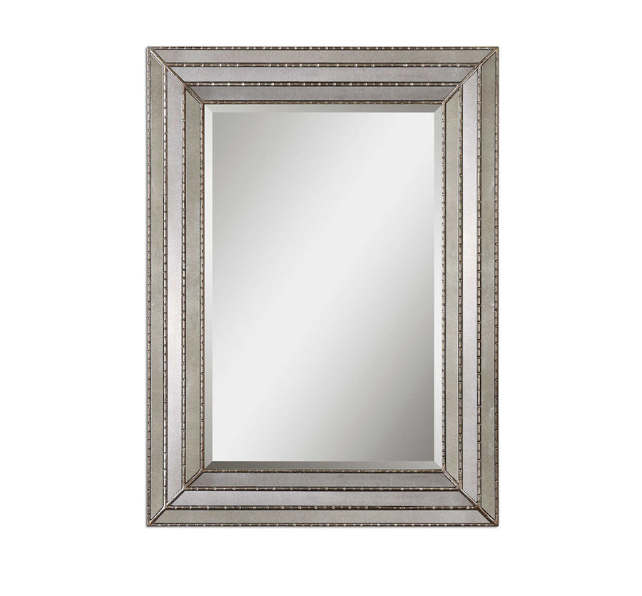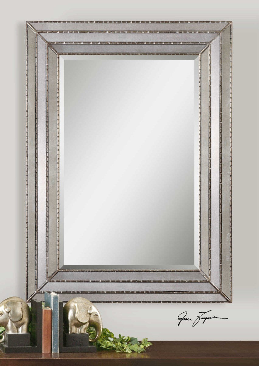 This mirror features a frame made of antiqued mirror inlays with burnished silver details. Center mirror features a generous 1 1/4" bevel. May be hung horizontal or vertical.