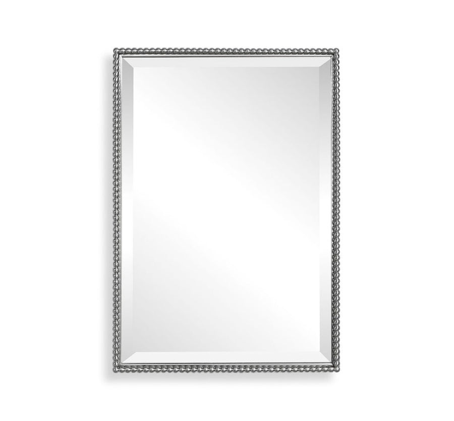 Brushed nickel, metal frame features a decorative beading design. Mirror features a generous 1 1/4" bevel and may be hung horizontal or vertical.