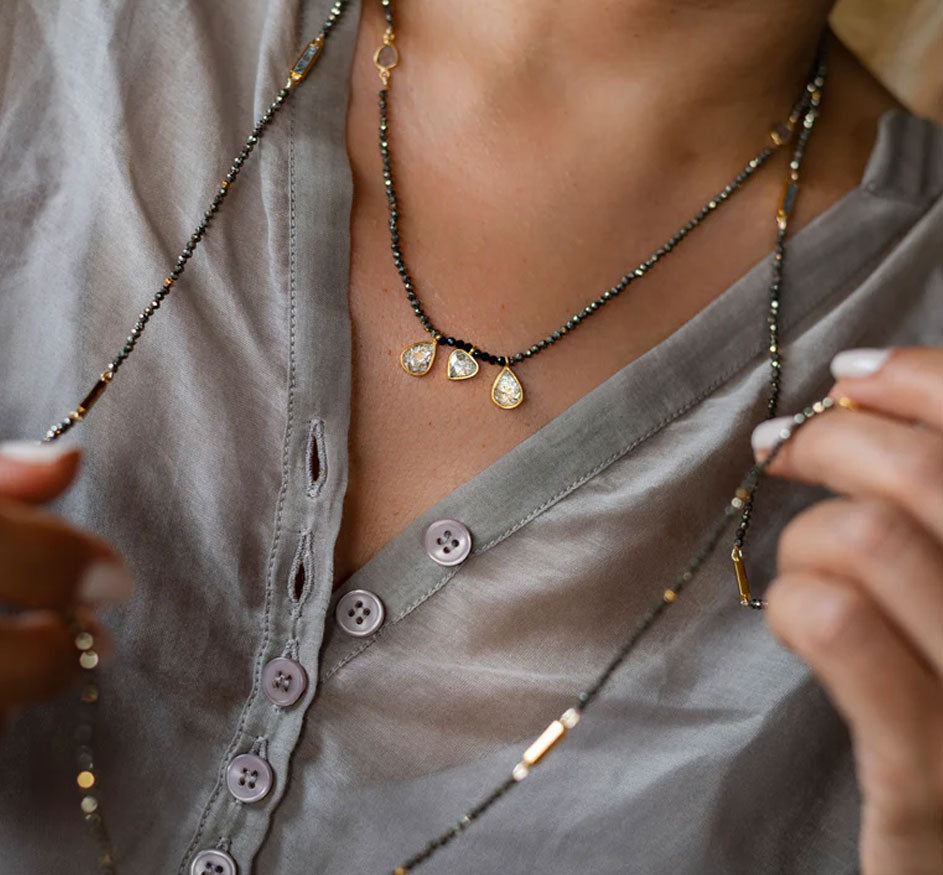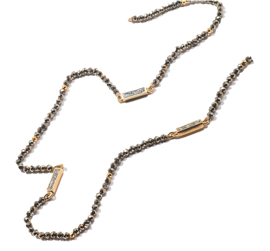This long, beaded necklace is punctuated by small bars of mosaic, uncut diamonds. This elegant necklace can be worn double-looped around your neck or left to hang in a long, slender strand. Available in multiple colors, this necklace can be easily paired or worn on its own. Pyrite helps you relieve anxiety and stimulate positive energy. Commonly referred to as a stone of action, it vitalizes ambition, helps you focus on your abilities, and increases your commitment to follow-through.