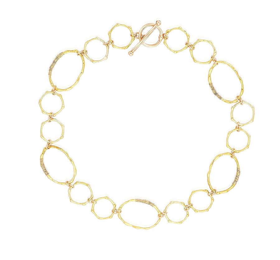 A mixed of casted oxidized and sterling silver hoops form this beautiful and statement necklace.