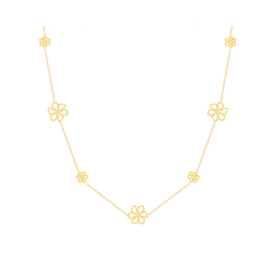 18k gold plated long necklace with small and medium flower decals attached throughout.
