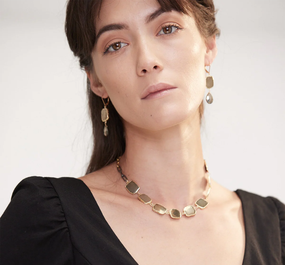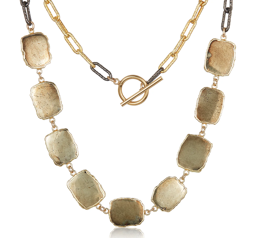 Bezel set pyrite flat slices necklace with gold plated and oxidized sterling silver paper clip chain. Choice of clasp: Regular lobster clasp or toggle clasp.