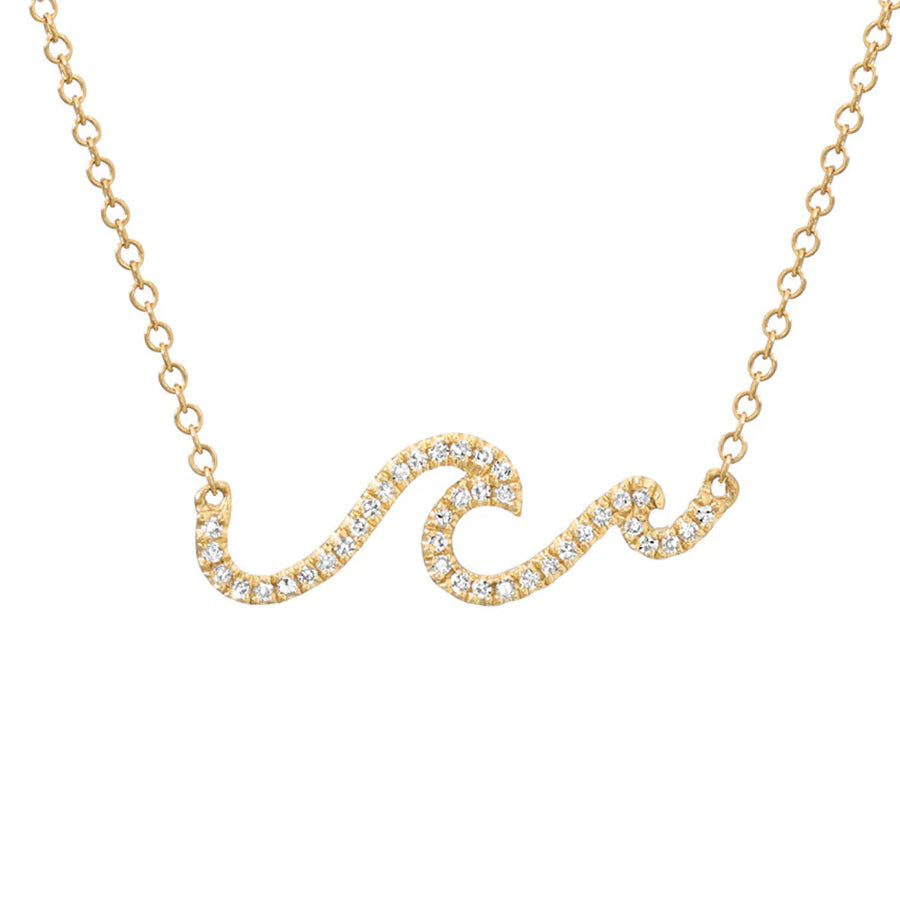 Born from a love of Hawaii, the Aloha Collection evokes the mood of the islands and the gentle vacation aloha. This necklace features a 14k gold and diamond waveform hanging from a 16-18" chain. Approximate length of wave: 21mm.