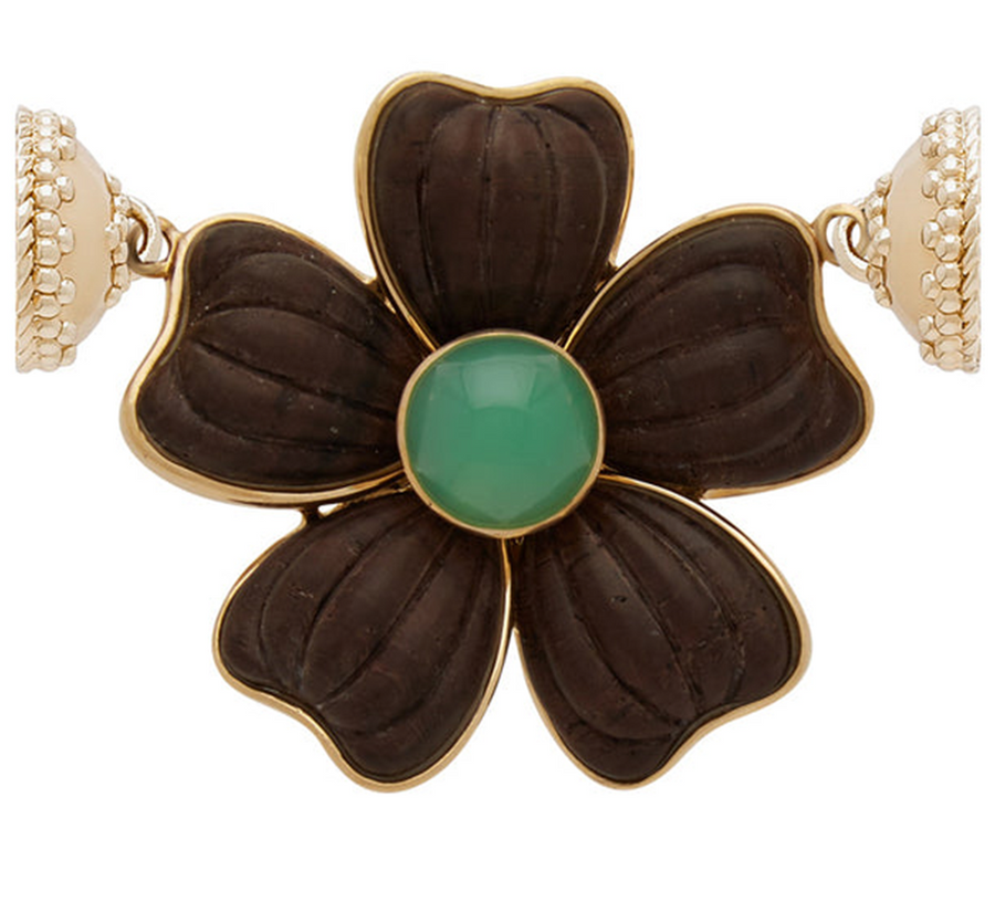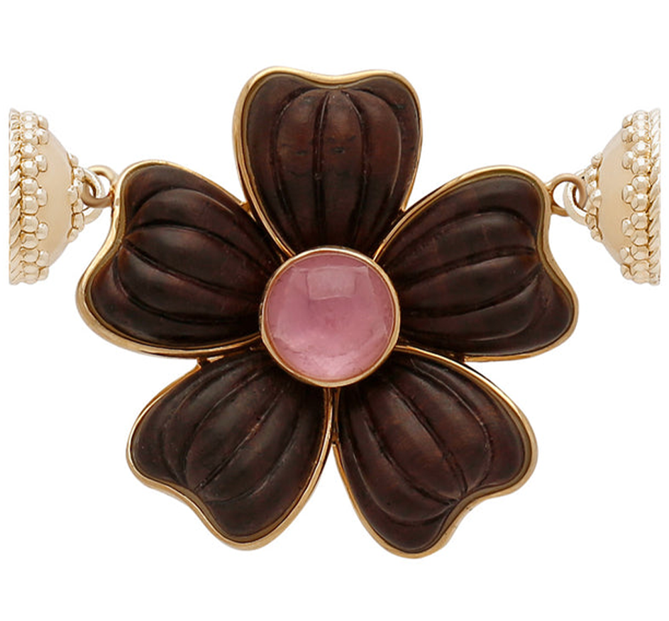 Carved rosewood petals set in 18k gold, arranged around a semi-precious center stone. Reversible to mother of pearl.