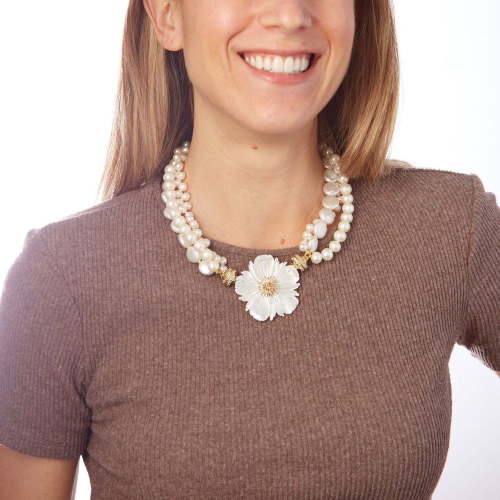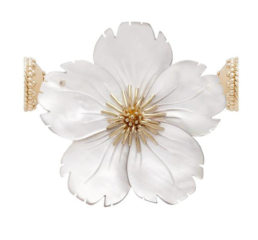 Refine any look with this carved mother of pearl flower and its 14k gold accents.