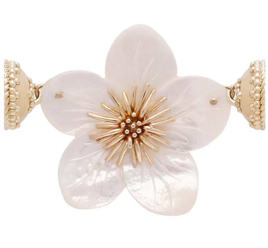 Refine any look with this carved mother of pearl flower and its 14k gold accents.