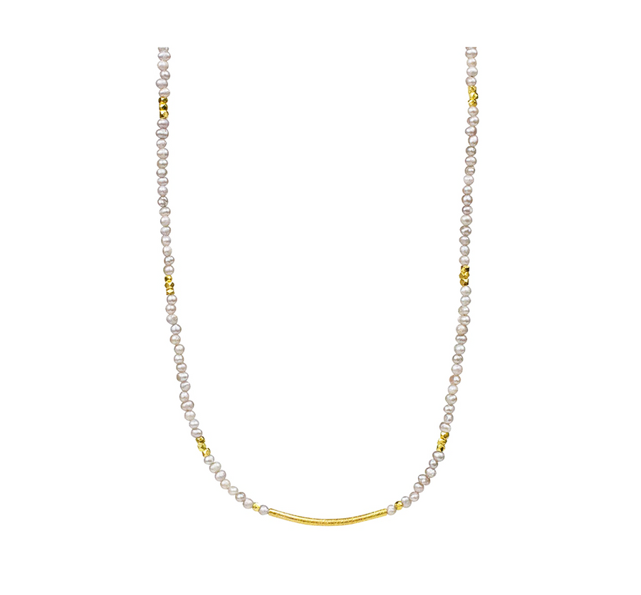 Zephyr is the ultimate layering piece. A string of freshwater pearl beads is offered extra shimmer with gold vermeil accents. This simple yet striking piece plays well alone or with others.