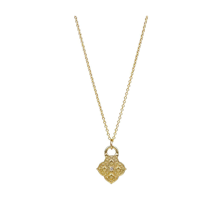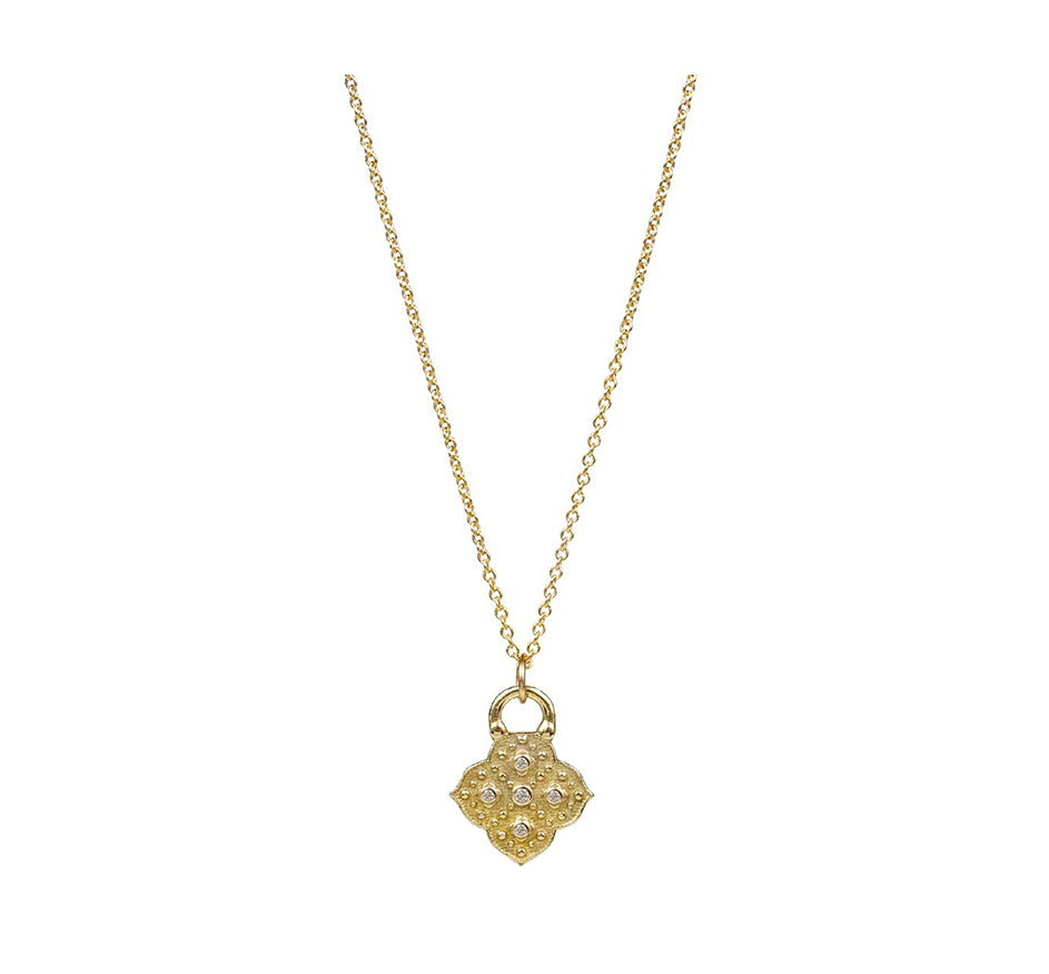 Get inspired with Muse. A graceful petaled pendant plays host to white diamonds, all surrounding a center stone accent.