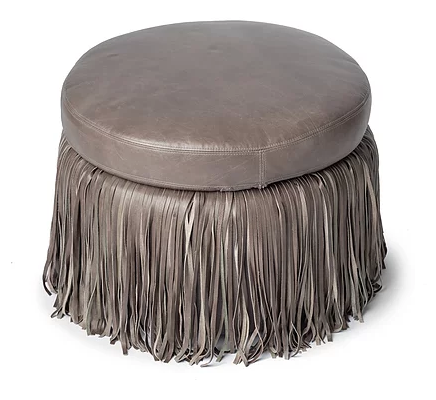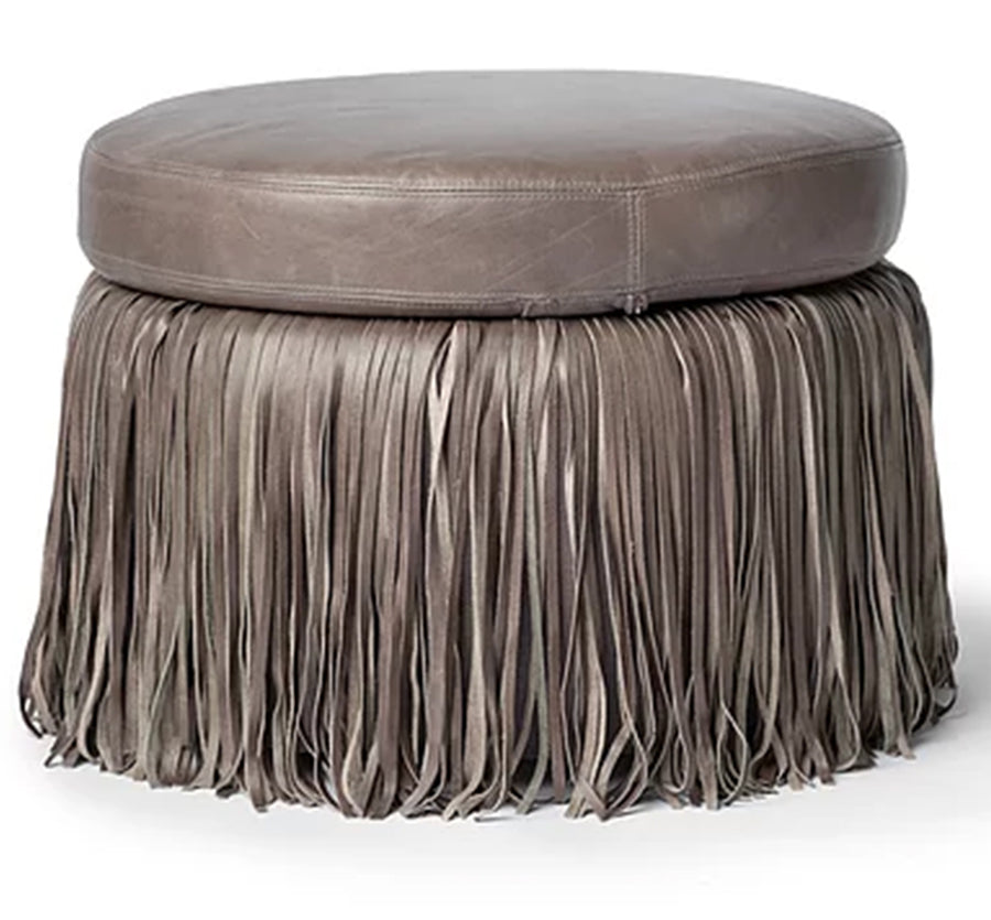 Form meets function in with this buttery soft grey leather fringed ottoman. It works for stylish extra seating, add a tray for a surface to put down drinks and snacks, or it is a great place to throw your feet up.