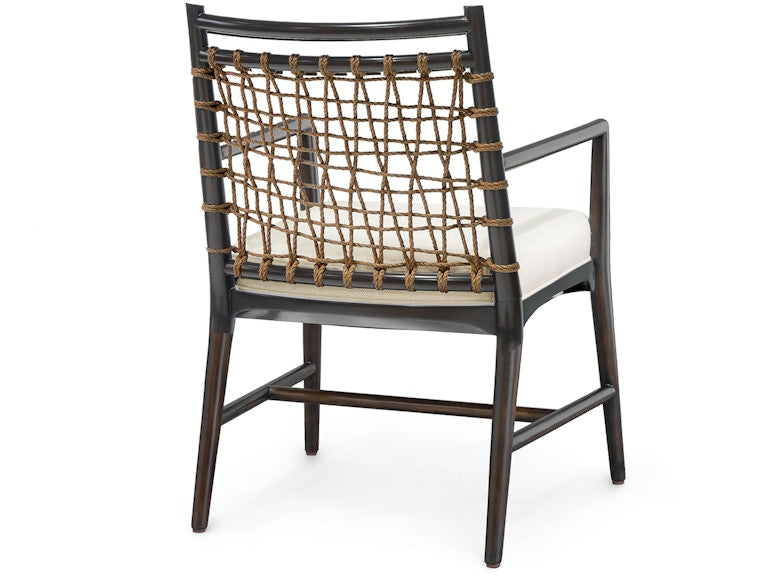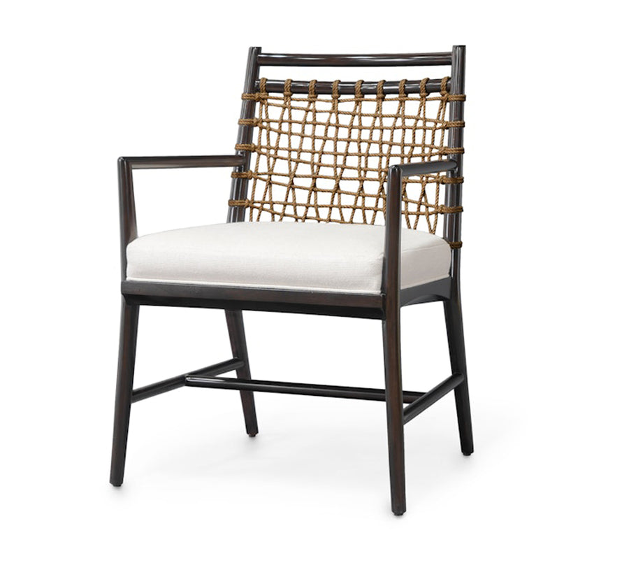 Kirk Nix collection. Plantation hardwood frame and legs in a dark espresso finish featuring natural jute rope in an open weave pattern. Chair comes with a fixed upholstered seat.