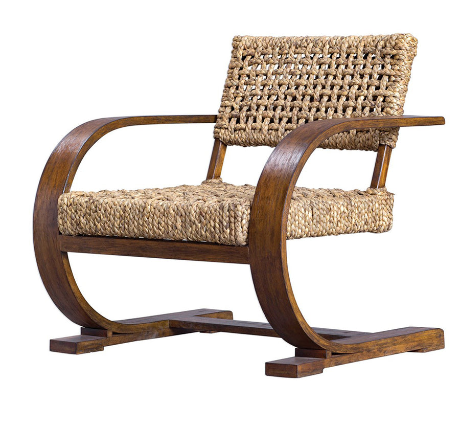 A modern bohemian accent, featuring a natural woven banana fiber seat on a curved solid wood frame giving flexible movement, layered in a teak veneer with a smooth weathered pecan stain. Seat height is 15".