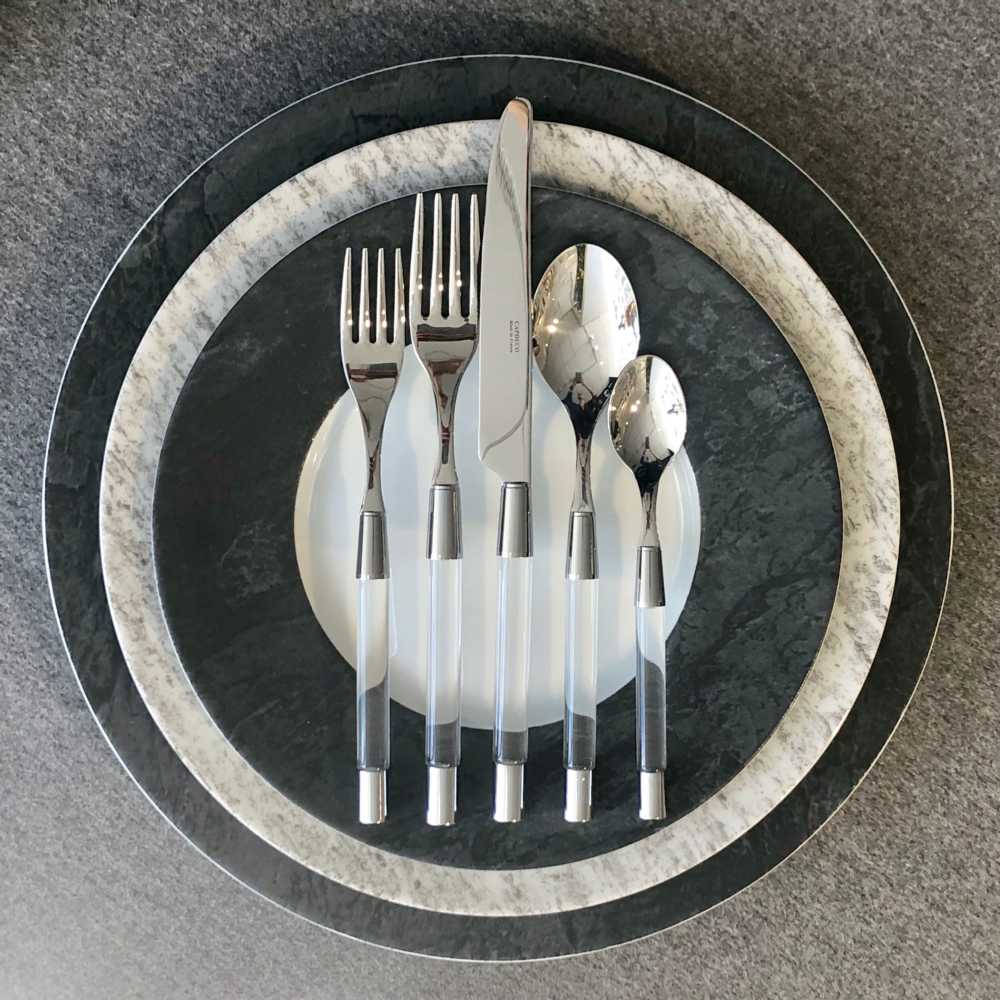 Our Zoe collection is simple and tasteful. The clear acrylic handle bolstered by a chrome-turned-brass ferrule reinforces the durability of stainless-steel construction in this flatware collection. Zoe, in all its beauty, will compliment your table and delight your guests.