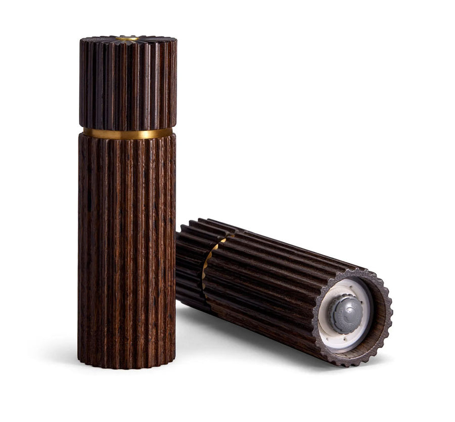 Complement to the Ionic porcelain objects, these salt and pepper mills are hand carved in natural European oak and smoked oak, adorned with handsome brass details, and expertly outfitted with a high-quality metal grinding mechanism.